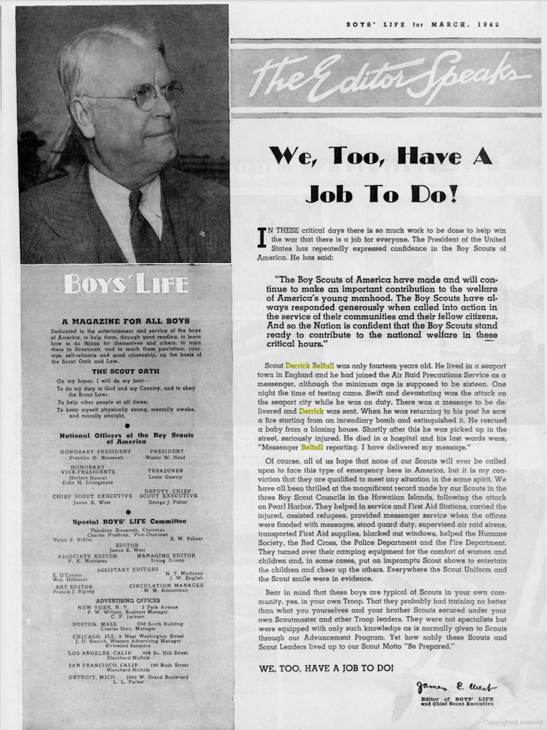 A little more than a year later, Derrick’s story reached our shores in the form of an editorial in Boy’s Life magazine from founder and Chief Scout Executive James E West: